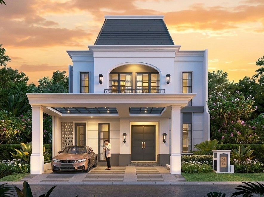 Salah satu unit yang mencuri perhatian adalah Type Caslano. Rumah ini dirancang dengan tampilan fasad modern elegan yang langsung memberi kesan mewah sejak pandangan pertama.
