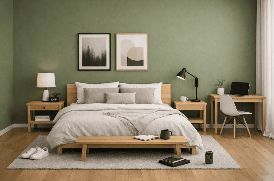 Olive green memberikan sentuhan alam yang menenangkan. Warna ini juga mampu menciptakan suasana kamar yang lebih hangat dan cozy.