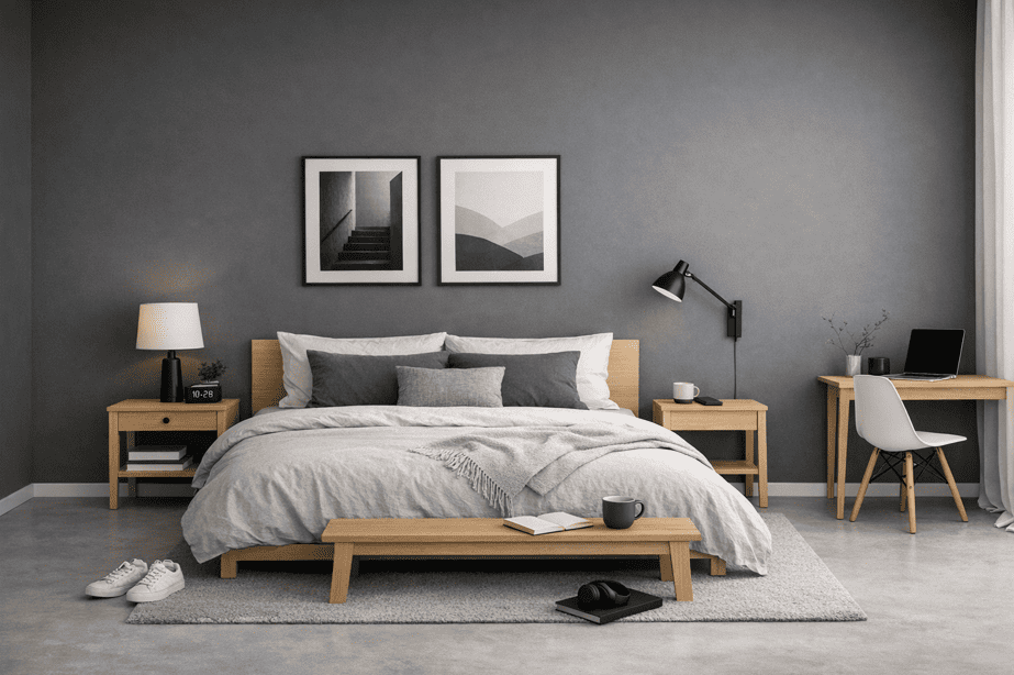 Charcoal grey memberikan kesan maskulin sekaligus elegan. Warna ini cocok untuk kamar tidur bergaya modern atau industrial. Dipadukan dengan pencahayaan yang tepat, charcoal grey bisa menjadi warna cat kamar tidur elegan yang sangat stylish.
