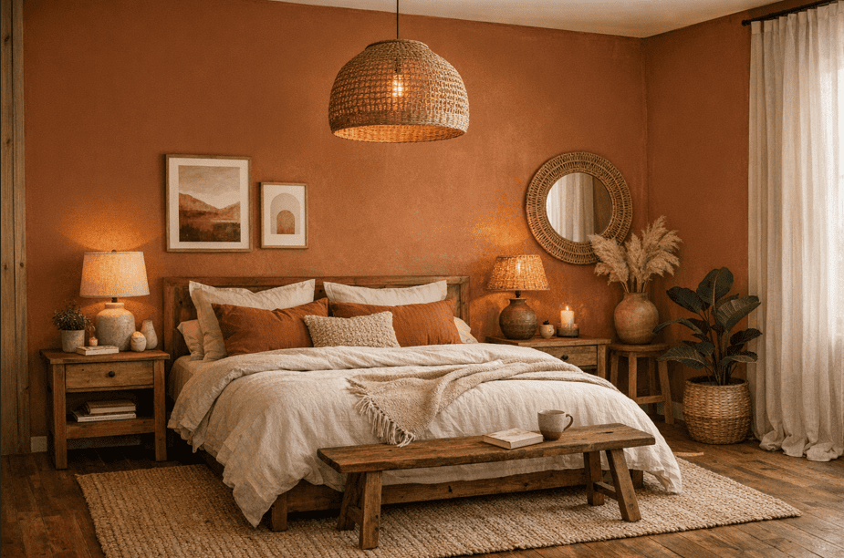 Terracotta memberikan nuansa hangat dan earthy yang sangat cocok untuk kamar tidur bergaya modern tropis. Warna ini juga mampu memberikan karakter kuat pada warna cat ruang kamar tidur tanpa membuat ruangan terasa terlalu gelap.