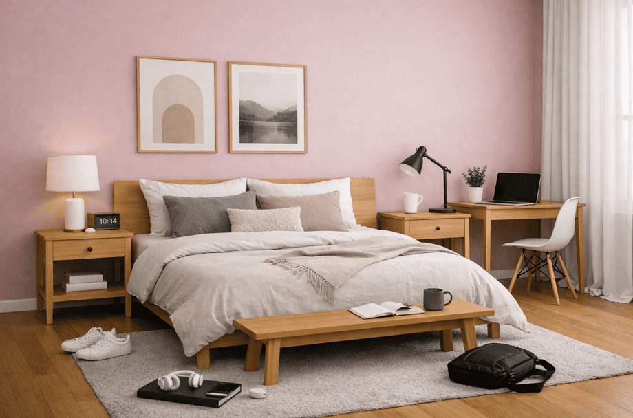 Dipadukan dengan furnitur kayu atau aksen emas, dusty pink dapat menciptakan warna cat ruang kamar tidur yang modern dan stylish.